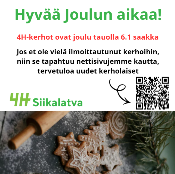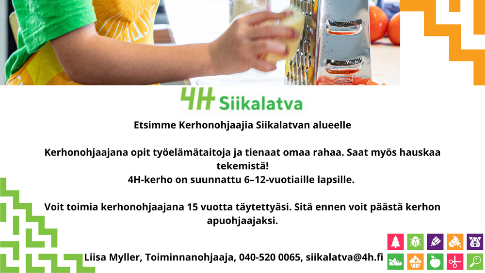 4H-kerhoissa eri puolilla Siikalatvaa lapset oppivat koulutettujen nuorten kerhonohjaajien tuella monipuolisesti kestävään elämäntapaan liittyviä arjen taitoja. Nuorille tarjoamme työelämä- ja yrittäjyystaitoja, vaikuttamismahdollisuuksia ja paljon muuta. 4H:n työpalvelussa vuosittain kymmenet siikalatvalaiset nuoret saavat tärkeitä ensimmäisiä työkokemuksia. 4H-yritys on upea mahdollisuus kokeilla yrittäjyyttä turvallisesti ja ohjatusti. 4H:ssa opitaan itse tekemällä ja osallistumalla aidoissa tilanteissa ja ympäristöissä. Tervetuloa mukaan!