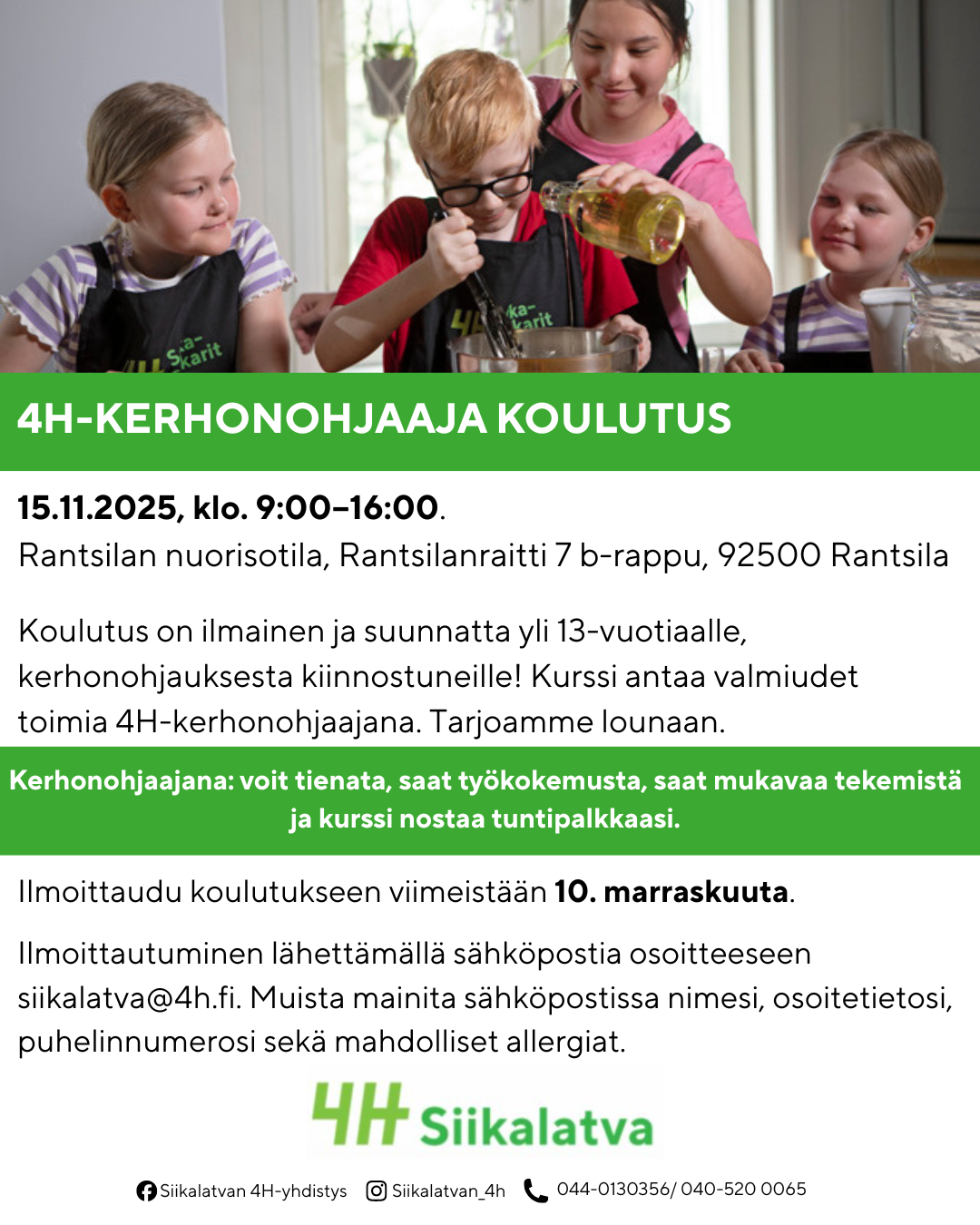 📚 4H-kerhonohjaaja koulutus 🗓 Päivämäärä ja aika: 15.11.2025 klo 9:00–16:00 📍 Paikka: Rantsilan nuorisotila Rantsilanraitti 7 b-rappu, 92500 Rantsila 💰Hinta: Ilmainen 🎯 Kenelle: Yli…